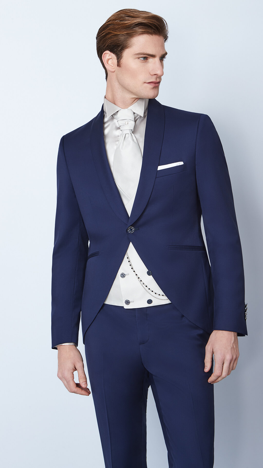 Abito Uomo chiusura con gemello, giacco collo a scialle, gilet doppio petto grigio uguale all cravattone bottoni in metallo